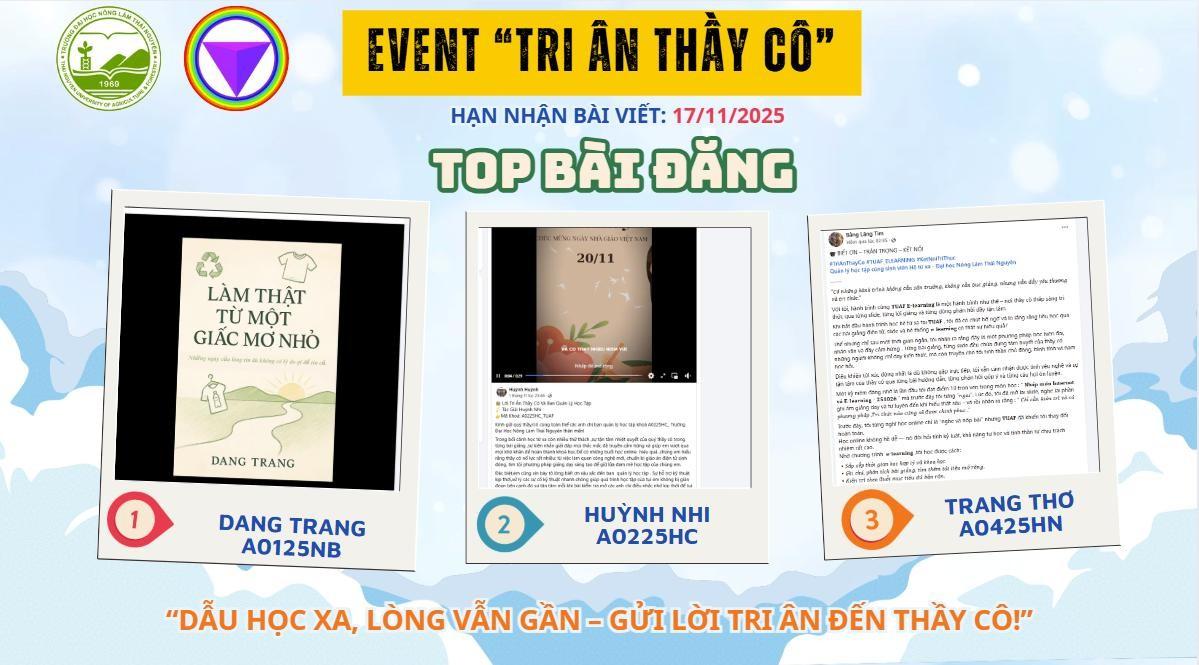 Hướng tới kỷ niệm Ngày Nhà giáo Việt Nam 20/11, từ ngày 01/11/2025, Trường Đại học Nông Lâm – Đại học Thái Nguyên phối hợp cùng Công ty Cổ phần Dịch vụ Tư vấn và Đào tạo AUM Việt Nam phát động hoạt động “Tri ân Thầy Cô” dành cho sinh viên hệ đào tạo từ xa theo phương thức E-learning.